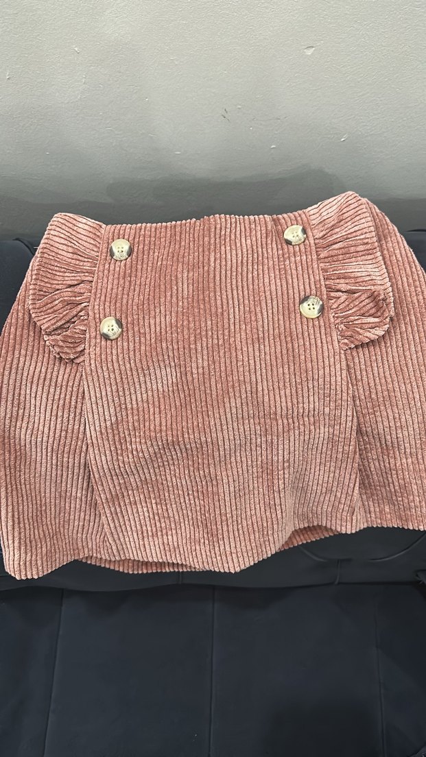 Düğmeli, pembe süet kumaştan yapılmış, vücuda oturan kız eteği. Yumuşak dokusu ve şık düğmeleriyle dikkat çeker.