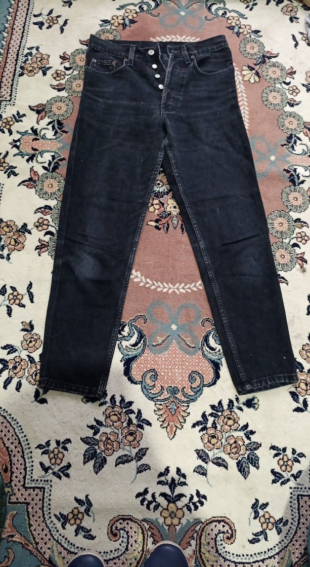 Düğmeli ön kısım ve beyaz çizgili desenli, siyah kadın kot pantolon.