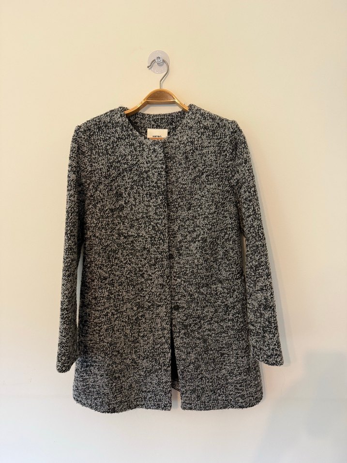 Düğmesiz ön kısmı ve dokulu kumaşıyla gri kaban, sade ve şık bir görünüm sunar. Uzun kollu ve rahat kesimlidir.
