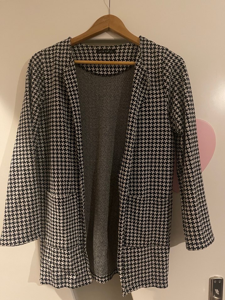 Kadın ceket, uzun kollu ve düğmesiz, notched yaka ile regular kesime sahiptir. Yumuşak sentetik kumaştan gri renkte, günlük kullanım için uygundur.