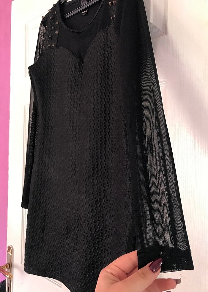 Omuz detayı taşlı kolları ve göğüs kısmı tül esnek kumaşa sahip defosuz sorunsuz hoş elbise