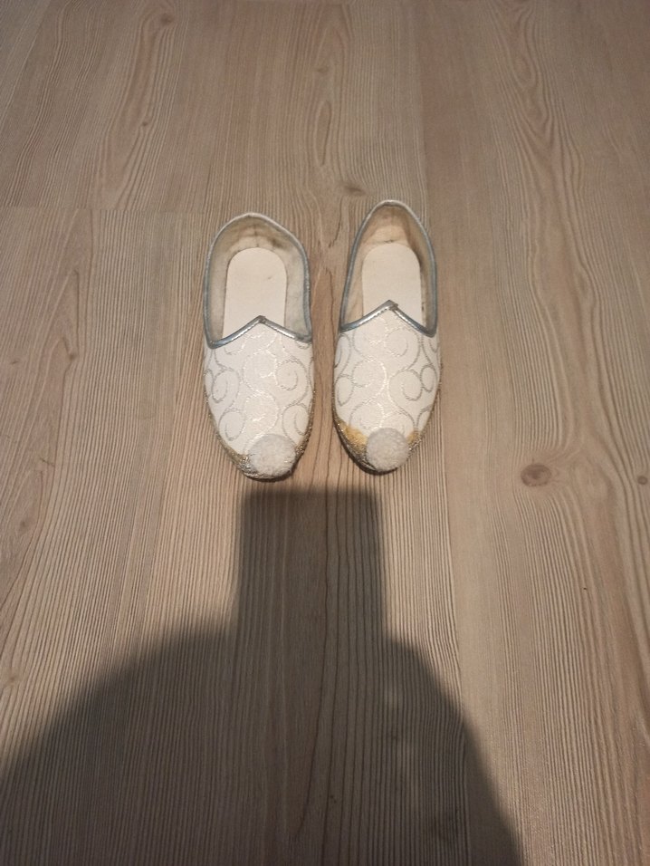 İpek gibi beyaz kumaştan yapılmış, nakışlı ve dantel detaylı erkek terliği. Minimalist tarzda, gri tonlarında, düğün için uygun. sadece 1 kez giyildi 32 numara sünnet ayakkabısı