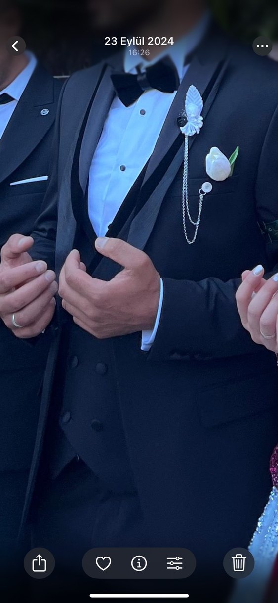 Parlak siyah renkte, klasik yakalı ve düğmeli modern klasik damat takımı. Normal uzunlukta, askılı kol ve düz desensiz tasarım. Düğünler için uygundur.