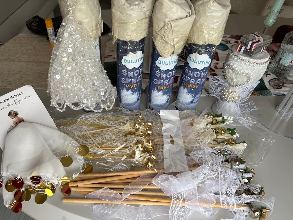 4 adet kar spreyi, 1 adet taşlı gelin mendili, 1 adet kalp detaylı iğnelik, 2 kutu iğne, 30 adet krem gold beyaz dantel detaylı zilli aksesuar, 1 adet nedime mendili.
