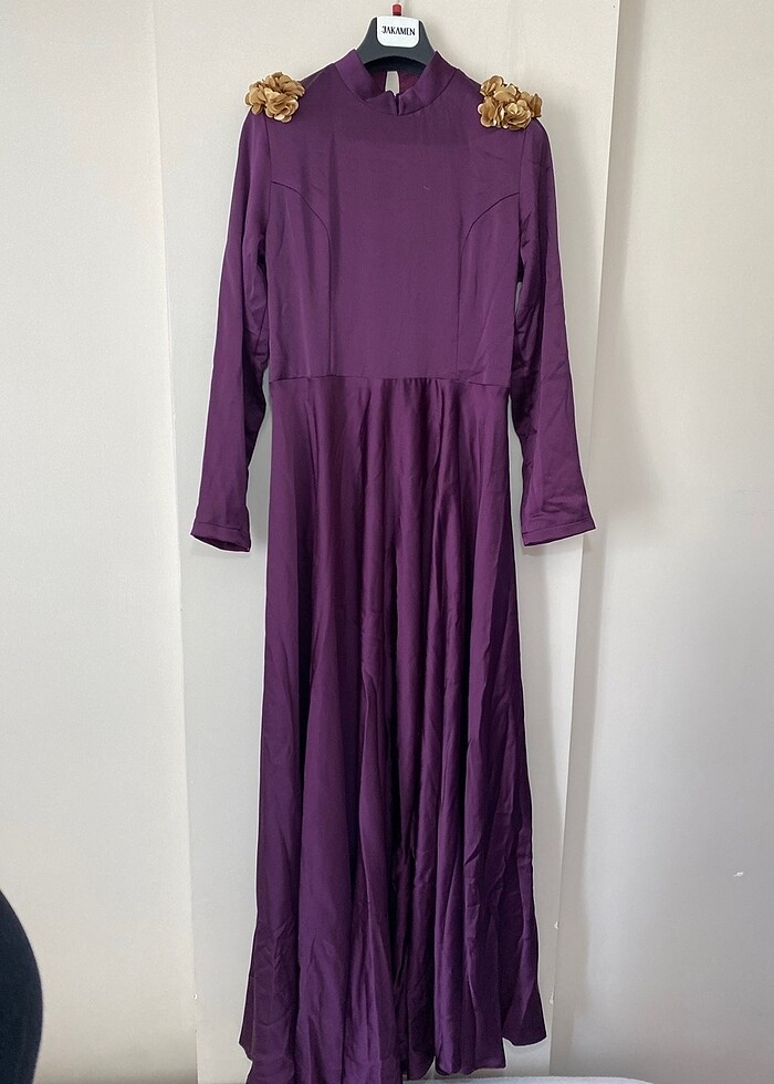 Saten görünümlü likralı abiyedir. Bir kez giyildi. 42-44 bedene olur. Bel 44 göğüs ölçüsü 48-50cmdir. Rengi mordur. Pazarlık yapılır
