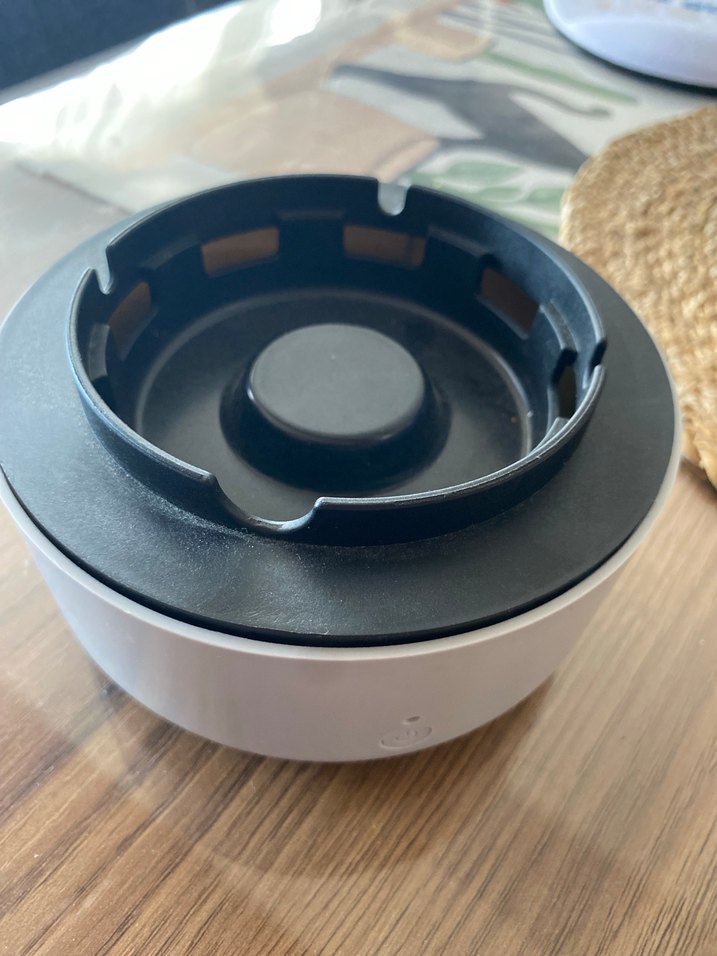 Beyaz ve gri renkte, kompakt yuvarlak tasarıma sahip hava temizleyici küllük. İç mekan havasını temiz tutar sigara dumanını hapseder