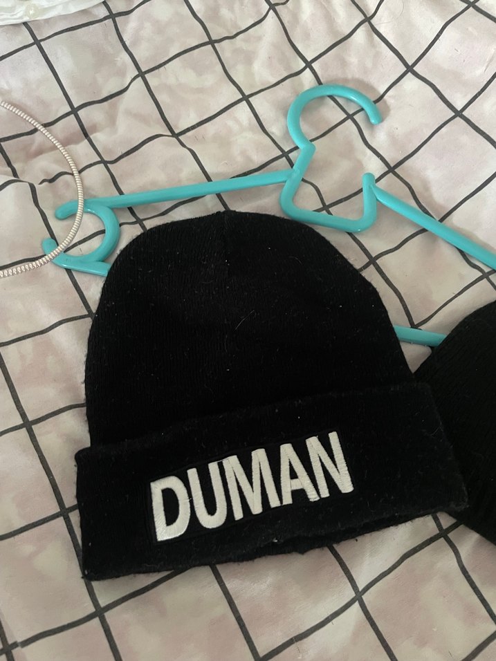 Siyah renkli, yumuşak ve sıcak dokulu örgü kadın bere, üzerinde "DUMAN" nakışı bulunur, sokak stiline uygun.