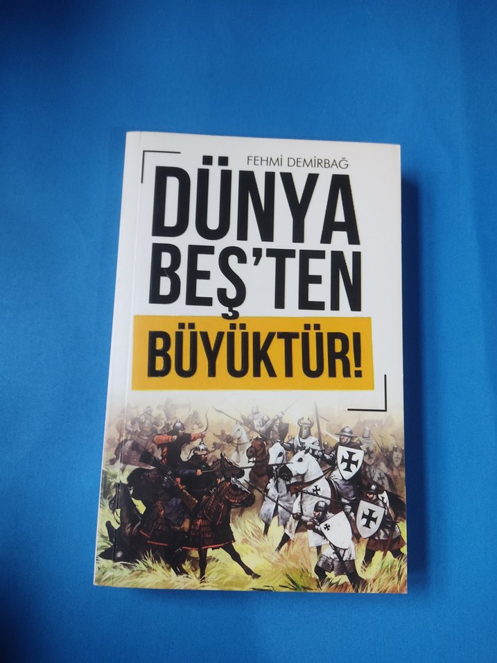 Fehmi Demirbağ'ın "Dünya Beş'ten Büyüktür" kitabı, önemli tarihi olayları ve perspektifleri ele alıyor. Kapakta ortaçağ şövalyelerinin savaşı yer alıyor.