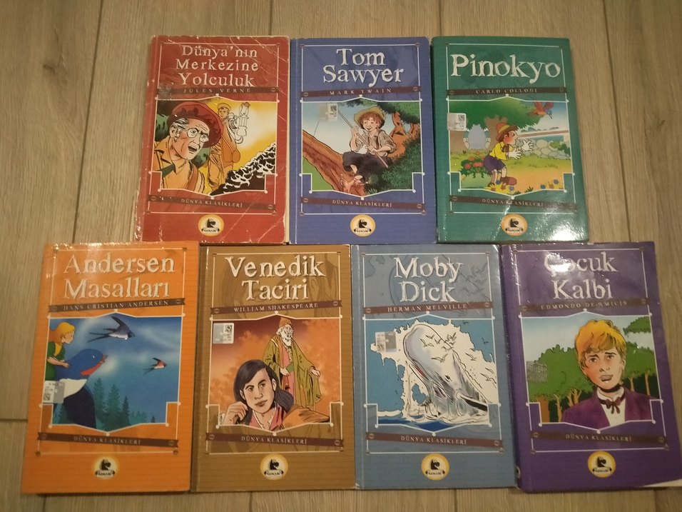 Tom Sawyer, Pinokyo, Moby Dick dünyanın merkezine yolculuk Andersen masalları Venedik taciri ve çocuk kalbi gibi klasik çocuk kitaplarından oluşan, Dünya Klasikleri seti. sadece dünyanın merkezine yolculuk kitabının kapağında hafif hasar var diğerleri tertemizdir