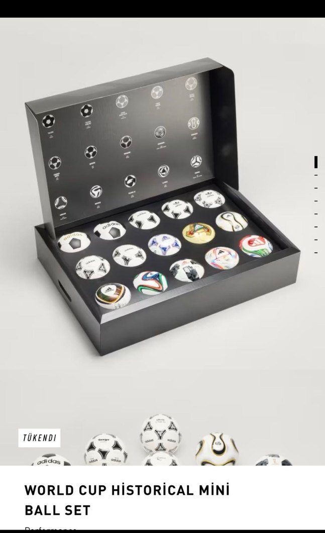 Siyah kutuda farklı Dünya Kupası dönemlerini temsil eden mini tarihi futbol toplarından oluşan oyun seti.