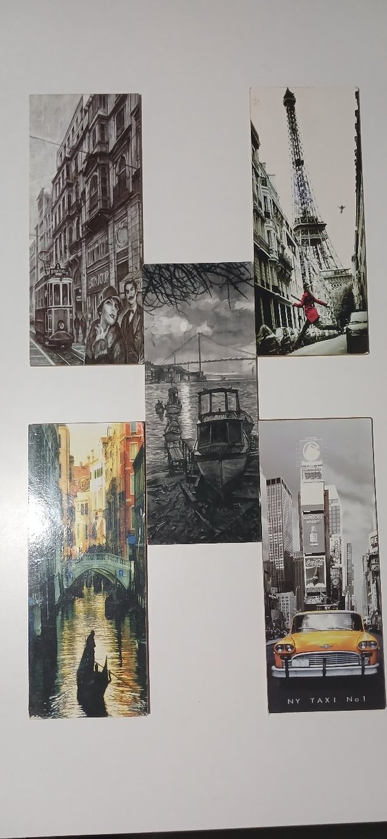 Paris, New York, Venedik ve İstanbul gibi şehirlerin ikonik manzaralarını içeren tablo koleksiyonu. ortalama 30 cm 5 adet