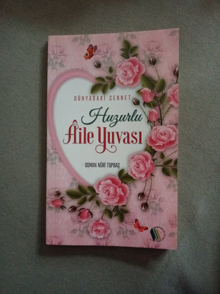 Osman Nuri Topbaş'ın 'Dünyadaki Cennet Huzurlu Aile Yuvası' adlı romanı, pembe güller ve kelebeklerle süslü kapak tasarımına sahiptir.