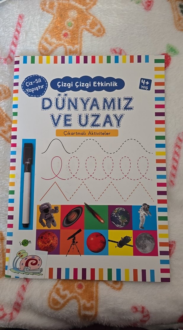 4 yaş ve üzeri çocuklar için dünyamız ve uzay temalı çizgi çizgi etkinlik kitabı. Çıkartmalı aktiviteler ve çizim kalemi mevcut değildir.
