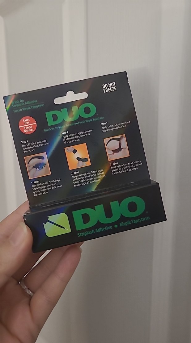 DUO kirpik yapıştırıcı güçlü tutuş sağlar. Paket üzerinde adım adım kullanım talimatları bulunur. Sıfır ürün
