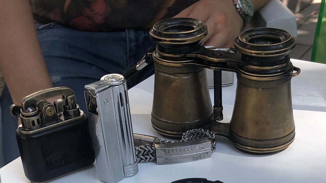 Altın ve gri renkte, antika tarzda klasik görünümlü dayanıklı dürbün. Koleksiyon için uygun.