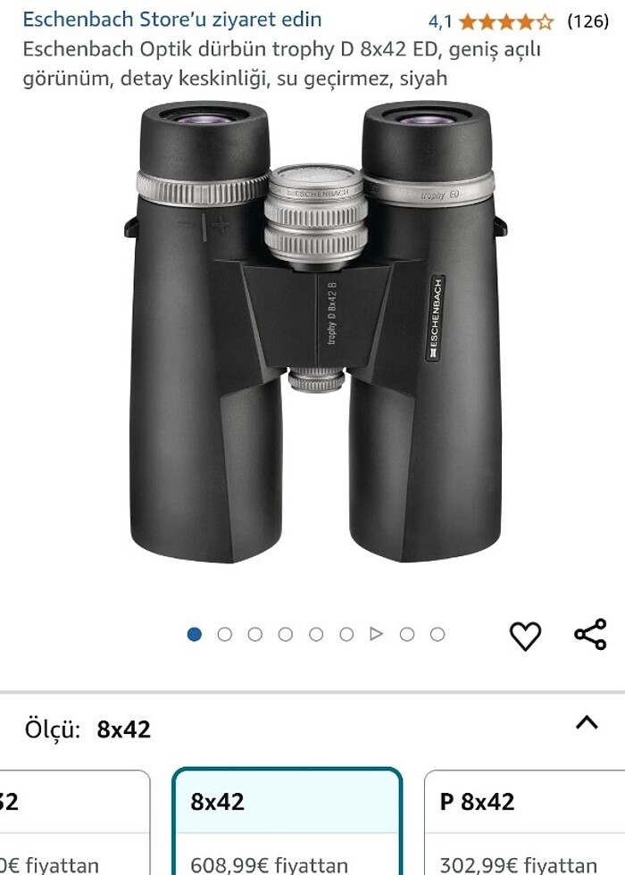 (eschenbach trophy d 8x42 bed) alman malı kaliteli dürbün şuan amazondaki fiyatı 23 bin tl civarıdır. Tek tarafının iç mercegi kırıktır yaptirilib kullanilabilir fiyatı o yüzden uygun tutdum.