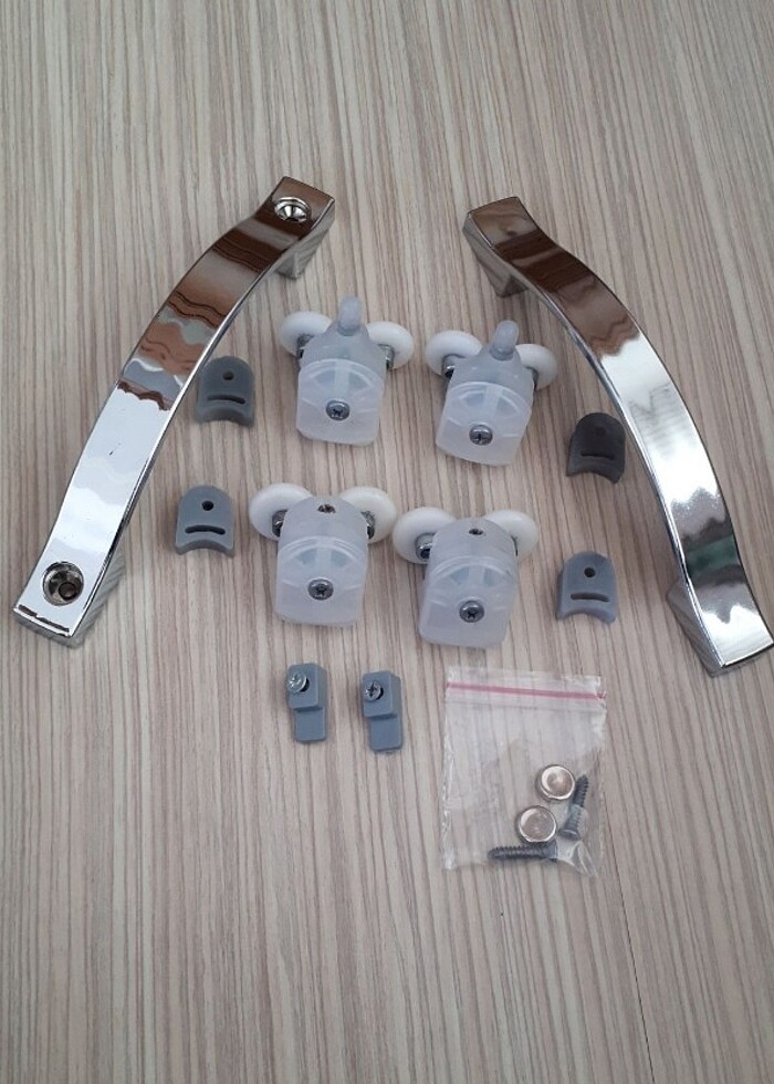 Şeffaf renkli,Rulmanlı dörtlü takım Duşakabin teker setidir.Ürün iki adet üst,iki adet alt tekerden oluşan,ve bütün aparatlarıda yanında bulunan Çift tekerli sağlam kırılmaz Duşakabin Teker setidir.Cam duşakabinler içindir.Duştekerleri boyu 3,5 cm.teker çapı ise 2,3 cm.dir. Sıfır kullanılmamış ambalajlı görselde görüldüğü gibi dusakabin dörtlü teker takımıdır.Dusakabin teker takımı yanında bir kapılık iç/dış olarak iki adet Gri renkli kapı kulpları,içinde montaj dubel ve vidaları ile birlikte verilecektir.Kapı Kulpları boyu 19 cm.Eni 2 cm.iki vida arası uzunluğu ise 14-16 cm.dir.Fiyat dörtlü teker takımı ve bir kapılık kapı kulpları fiyatıdır.İsteyen duşakabin teker takımının tam takım sekizli teker seti olarak siyah,gri ve şeffaf renkleride görselde İlanlarımda mevcuttur.