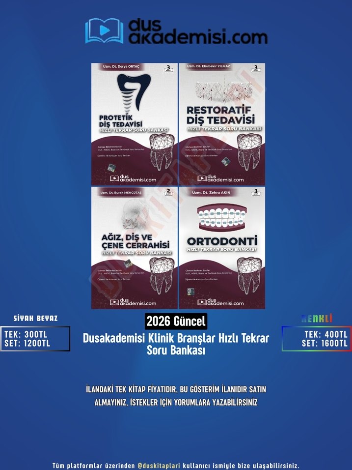 "Dusakademisi Klinik Branşlar Hızlı Tekrar Soru Bankası Seti” ilanıdır. Siyah-beyaz veya renkli spiralli şekilde tüm Türkiye'ye ücretsiz kargolanır. Tüm fiyatlar ilan görselinde belirtilmiştir. İlandaki tek kitap fiyatıdır, belirtilen haricinde indirim yoktur. #dus #duskitaplari #dusdata #tusdata #kitap #ders #calisma #sorukitabi #soru #dusdatamax #datamax #dusakademi #konu #konukitabi #hizlitekrar #tml #dusmeslek #bransdenemesi #brans #renkli #siyahbeyaz #denttest #ucuz #1+2 #tts #tumdus
