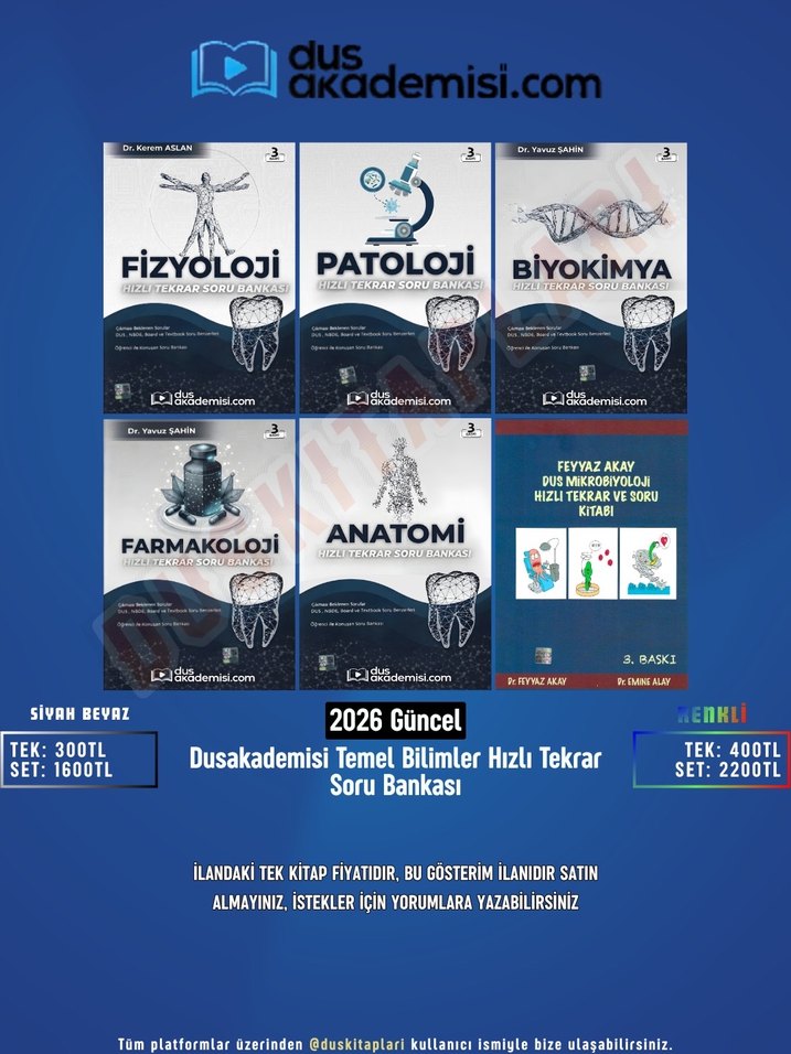 "Dusakademisi Temel Bilimler Hızlı Tekrar Soru Bankası Seti” ilanıdır. Siyah-beyaz veya renkli spiralli şekilde tüm Türkiye'ye ücretsiz kargolanır. Tüm fiyatlar ilan görselinde belirtilmiştir. İlandaki tek kitap fiyatıdır, belirtilen haricinde indirim yoktur. #dus #duskitaplari #dusdata #tusdata #kitap #ders #calisma #sorukitabi #soru #dusdatamax #datamax #dusakademi #konu #konukitabi #hizlitekrar #tml #dusmeslek #bransdenemesi #brans #renkli #siyahbeyaz #denttest #ucuz #1+2 #tts #tumdus