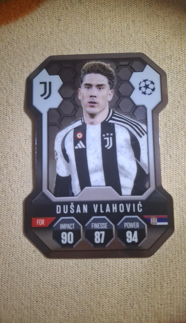 Dušan Vlahović'un Juventus formasıyla yer aldığı, etkileyici, zarafet ve güç istatistiklerini gösteren koyu renkli futbol rozeti. ⚽