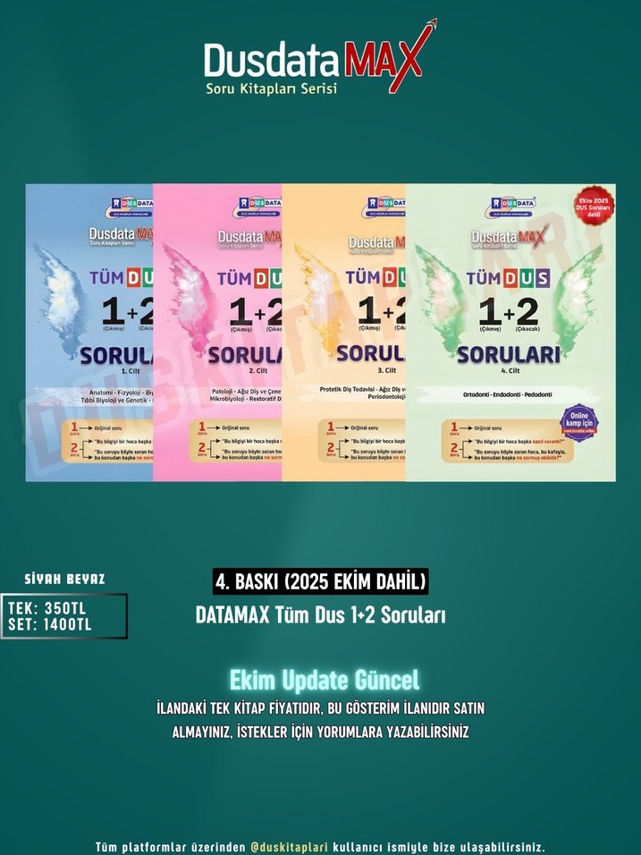 "DUSDATAMAX TÜM DUS 1+2 Soru Kitapları Serisi" ilanıdır. Siyah-beyaz spiralli şekilde tüm Türkiye'ye ücretsiz kargolanır. Tüm fiyatlar ilan görselinde belirtilmiştir. İlandaki tek kitap fiyatıdır, belirtilen haricinde indirim yoktur. #dus #duskitaplari #dusdata #tusdata #kitap #ders #calisma #sorukitabi #soru #dusdatamax #datamax #dusakademi #konu #konukitabi #hizlitekrar #tml #dusmeslek #bransdenemesi #brans #renkli #siyahbeyaz #denttest #ucuz #1+2 #tts #tumdus