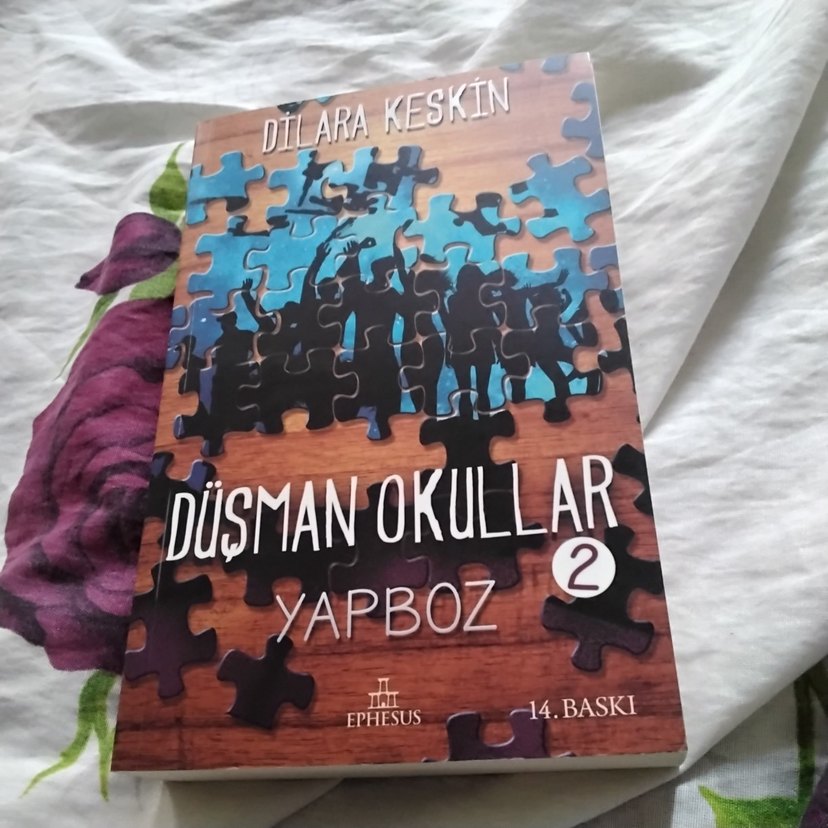 Dilara Keskin'in "Düşman Okullar 2 Yapboz" kitabı, çok renkli koyu tonlarda yapboz temalı kapak tasarımına sahiptir. Ephesus tarafından 14. baskı olarak yayımlanmıştır.