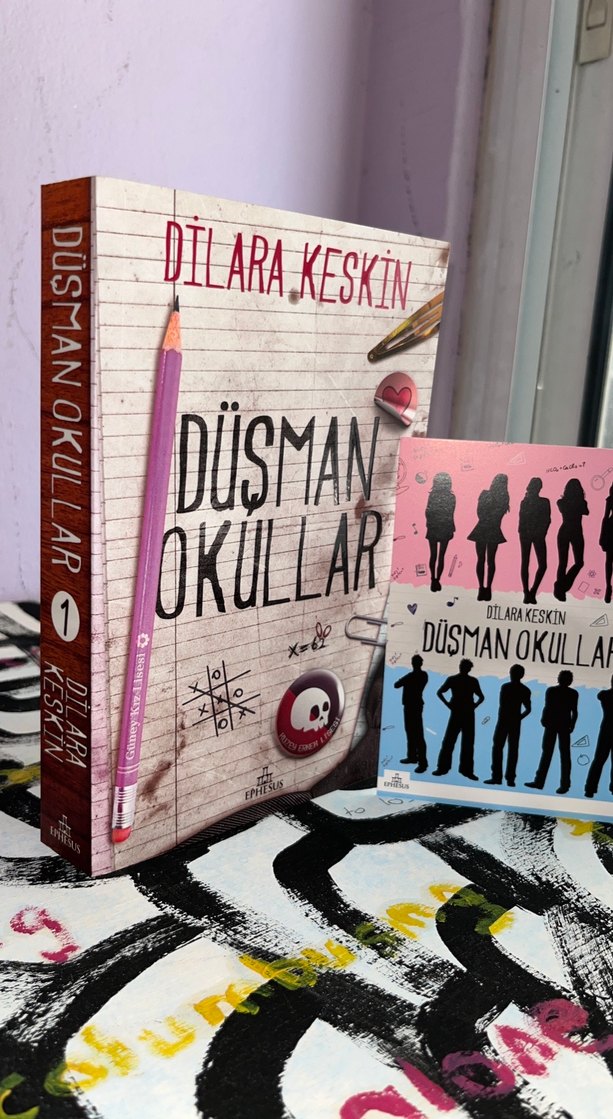 Dilara Keskin'in "Düşman Okullar" adlı romanı, okul temalı rekabetçi ve gençlik dolu bir hikaye sunuyor. Kapakta kalem ve eğlenceli çizimler yer alıyor.