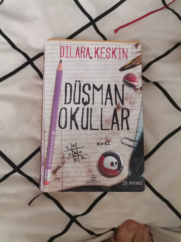 Dilara Keskin'in 25. baskı romanı 'Düşman Okullar' okul temalı çizimlerle kaplanmış.