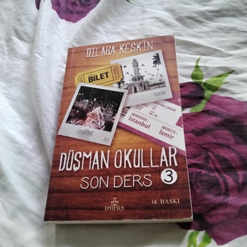 Dilara Keskin'in "Düşman Okullar Son Ders 3" romanı, İzmir ve İstanbul temalı bilet ve fotoğraflarla süslenmiş kapak tasarımına sahip. Ephesus yayınevi, 14. baskı seri haldede alinabilir tekte