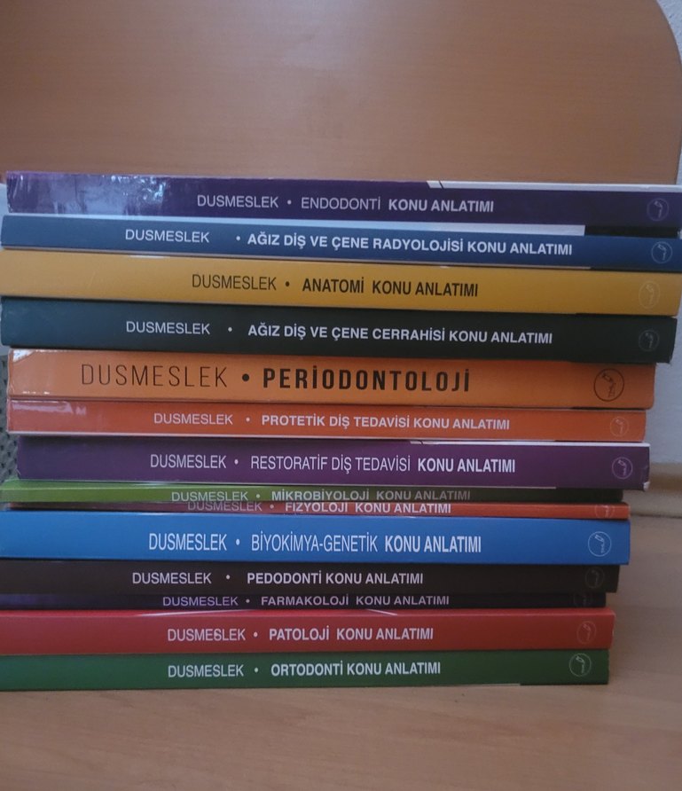Anatomi, radyoloji, periodontoloji, protez ve restoratif diş tedavisi, mikrobiyoloji, biyokimya, farmakoloji, patoloji ve ortodonti konularını içeren diş hekimliği ders kitapları seti. klinik bilimler dolu, temel bilimler boş