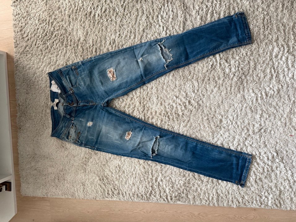 Orijinal marka , tamamen defosuz eski ürün olduğu için materyali sağlam . Düşük bel , dizleri yırtık, üst kisimlara kendim pullu yama yapmıştım isteğe göre çıkartılabilir. 1.70cm 63kg da giydim
