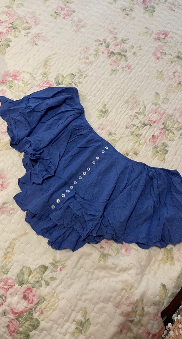 Nakışlı detaylara sahip, pastel mavi renkli, midi boyda ve bol kesim Gözlüklü detaylar ve volanlı katmanlar bulunur.