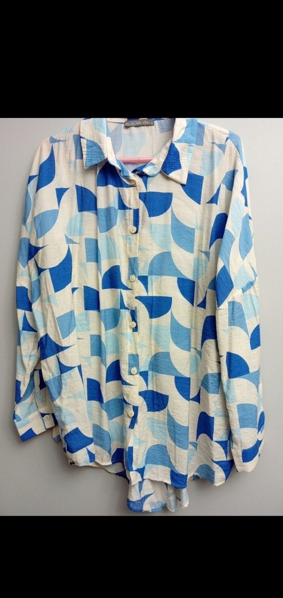 Yumuşak ayrobin kumaştan, pastel mavi desenli, düğmeli uzun kollu, salaş kesim kadın gömleği, günlük kullanıma uygun.