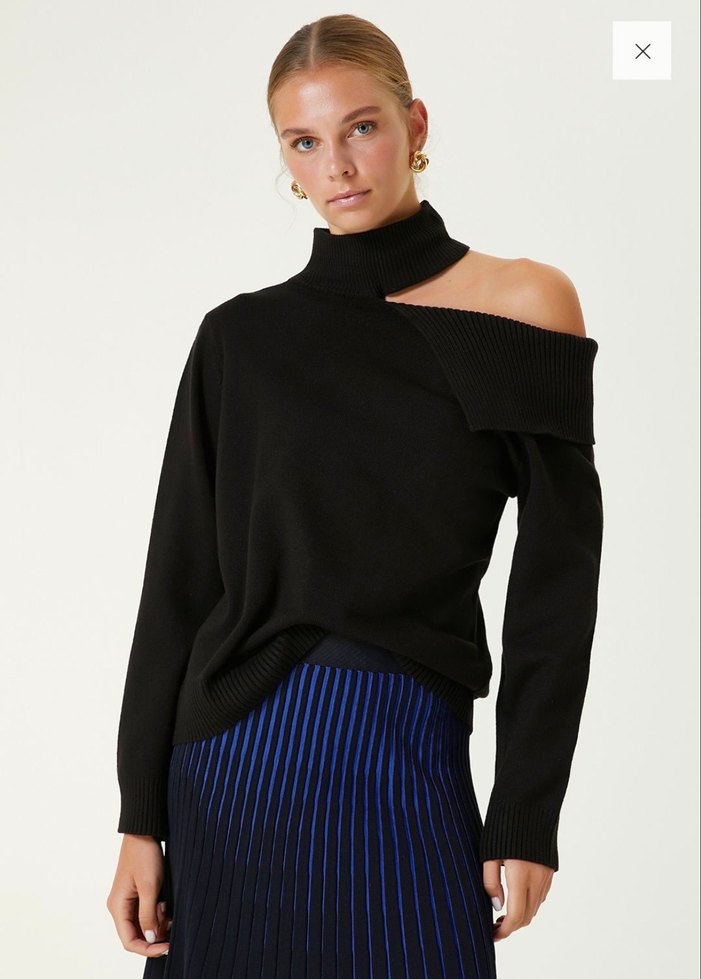 Bu siyah örgü kazak, yüksek yakalı ve uzun kolludur. Bol kesimi ve düşük omuz detayıyla çağdaş ve avangart bir tarz sunar. Bej renk S ve L ve siyah renk S beden var