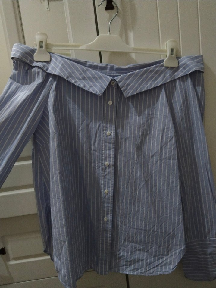 Mavi, beyaz çizgili düşük yaka fransız kadın gömlek. üstte çok şık durur. pazarlığa açığım