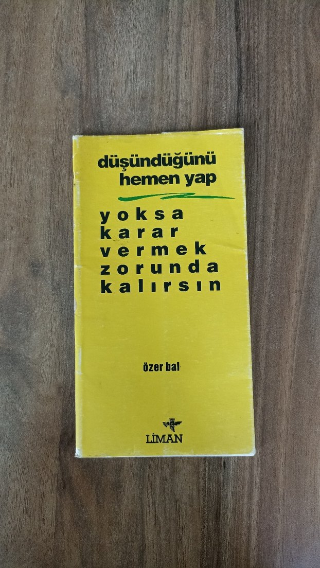 Sarı kapaklı 'Düşündüğünü Hemen Yap' adlı kitap, Özer Bal tarafından yazılmıştır. Kararsız kalmamak için düşünceleri hemen uygulamayı teşvik eder. Liman yayınevi.