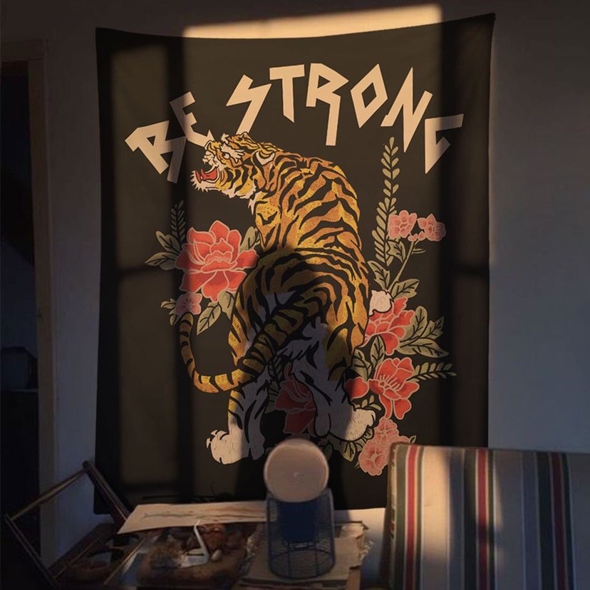 Bohem tarzda, "Be Strong" yazılı baskılı kaplan ve çiçek desenli koyu kahverengi perde.