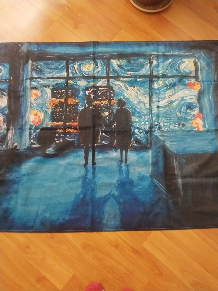 İki kişinin el ele tutuştuğu, yıldızlı gece gökyüzü ve şehir ışıklarının olduğu pencereye bakan koyu mavi tonlarda duvar halısı.en 1 m.boy 1.5 m kalın kumaş. süet gibi bir dokusu var