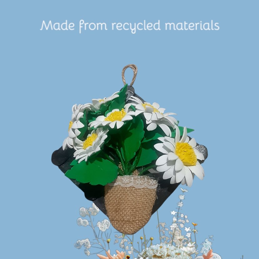 Geri dönüştürülmüş malzemeden yapılmış, beyaz yapraklı ve yeşil yapraklı renkli papatya dekoru, rustik bir saksıda. ♻️