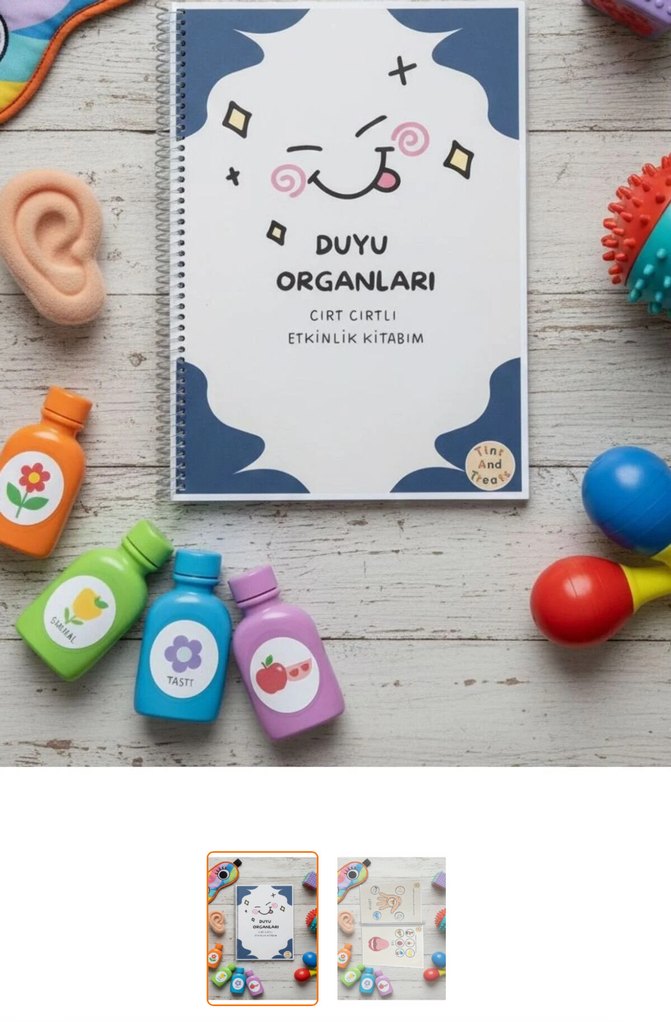 Çocukların duyu organlarını eğlenceli ve görsel destekle öğrenmesini sağlayan Laminasyonlu – dayanıklı – cırt cırtlı Eğitim seti. Toplam 11 sayfa olup 5 duyu organı (görme, işitme, tatma, dokunma, koklama) sade ve anlaşılır şekilde işlenmiştir. İçerik: Her duyu organı için kısa ve net açıklamalar + örnek resimler Özellikler: Tüm sayfalar Laminasyonlu (dayanıklı ve uzun ömürlü) Büyük, sade ve dikkat dağıtmayan görseller Özel eğitim ve okul öncesine uygun İnce motor, dikkat ve kavram öğrenimini destekler Tekrar tekrar kullanılabilir cırt cırt sistemi Kimler için uygun? 3 yaş ve üzeri Okul öncesi Özel eğitim öğrencileri Evde destekleyici çalışma yapmak isteyen aileler Kitabın içeriği aynı olacak şekilde yerleşim şekli değişiklik gösterebilmektedir