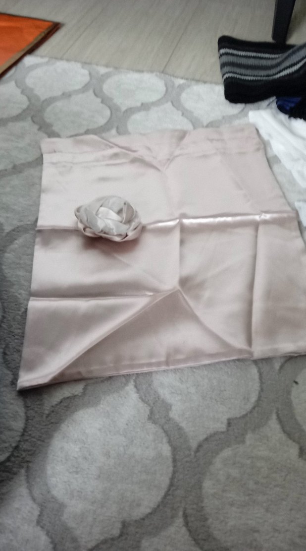 Düz bej renkte, hafif parlak ve yumuşak dokulu kese terlik ,havlu konulur Üzerinde dekoratif kumaş çiçeği bulunur. ️