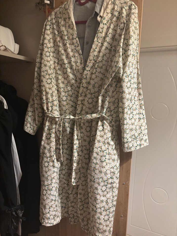 Düz beyaz ve gri tonlarında, uzun kollu, notched lapel yakalı ve bol kesim midi uzunlukta.