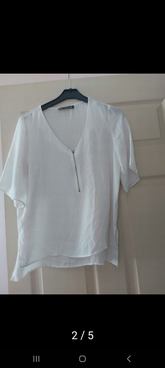 Düz beyaz şifon kumaştan, V yaka ve kısa kollu, fermuarlı, salaş kesim bluz, günlük kullanıma uygun. en 48, ön Boy 58,arka boy 65 cm