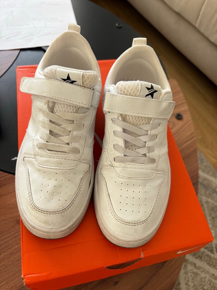 Düz beyaz unisex spor ayakkabısı, cırt cırtlı detaylıdır. Kauçuk malzemeden yapılmış, az giyildi.