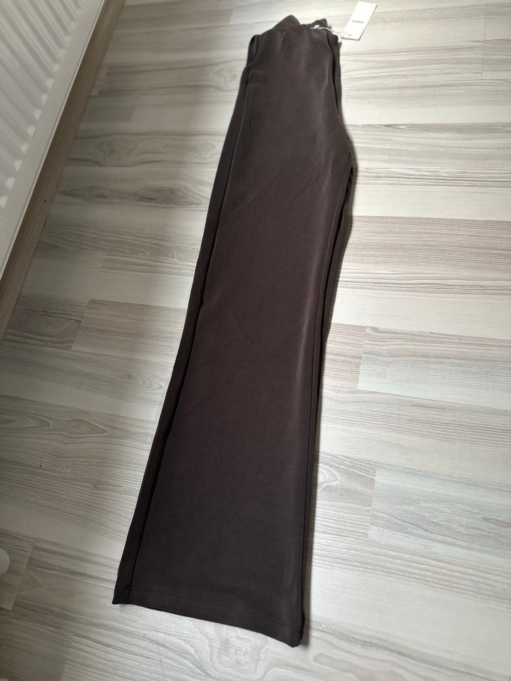 Düz kahverengi kadın kumaş pantolon, uzun boy ve normal kesim. Yumuşak sentetik kumaştan, yanlarda yırtmaç detayıyla günlük kullanıma uygun.