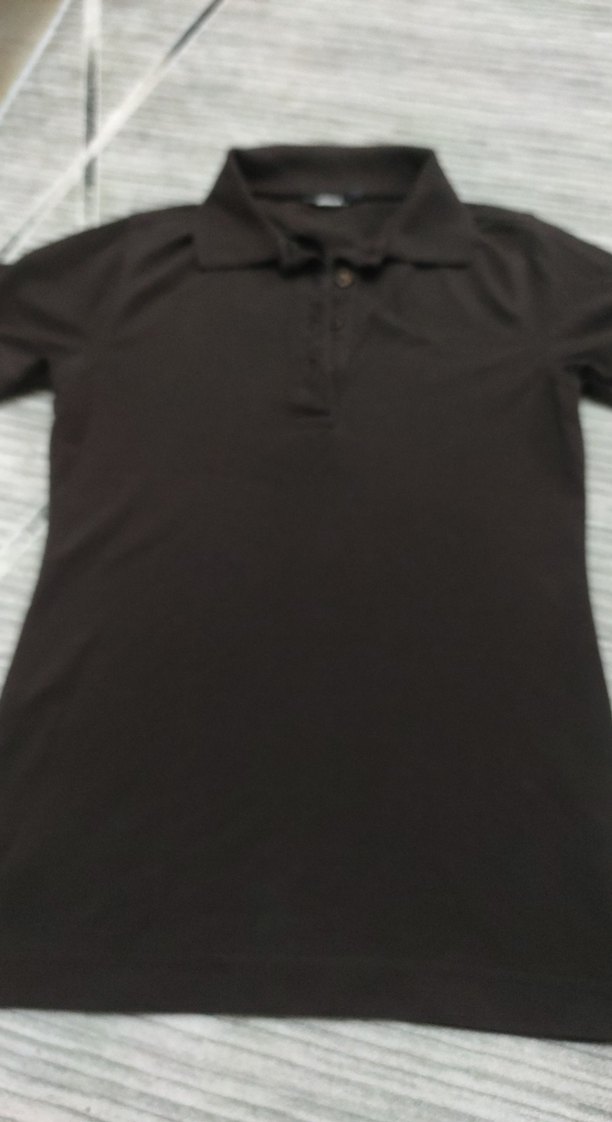 Düz kahverengi, kısa kollu, düğmeli yakalı ve vücuda oturan kesime sahip sentetik kumaştan polo tişört. boy 61 en 41 cm