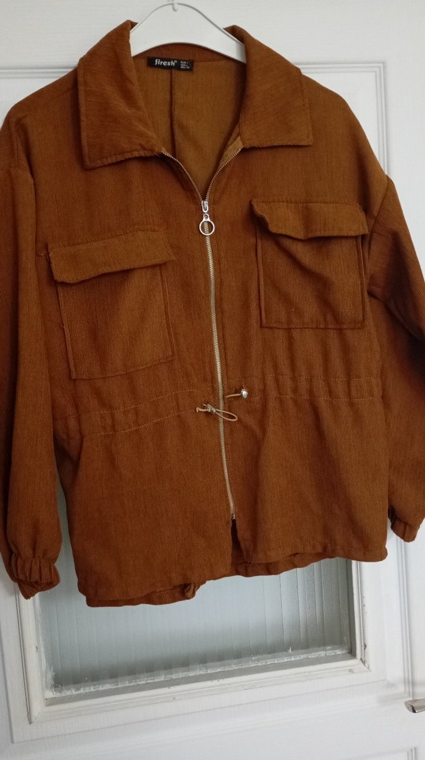 Kahverengi keten ceket, fermuarlı ön, kesimli yaka ve uzun kolludur. Bol kesim, iki cep ve belde bağcık detayına sahiptir. Günlük rahat stil için uygundur.