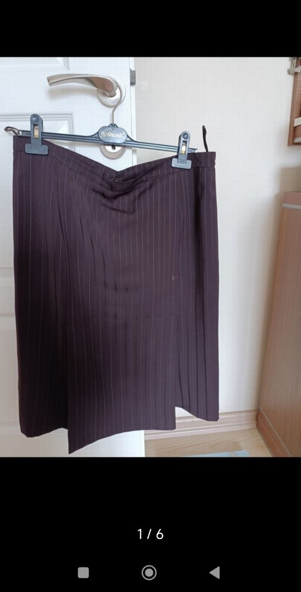 Kahverengi midi uzunlukta, piliseli ve düz desenli kadın eteği. Sentetik kumaştan, düzenli kalıplı, iş ve günlük stil için uygun.
