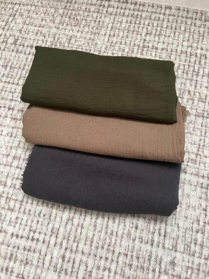 Düz desenli, kahverengi ve koyu tonlarda, yumuşak kumaştan yapılmış yazma yemeni seti.