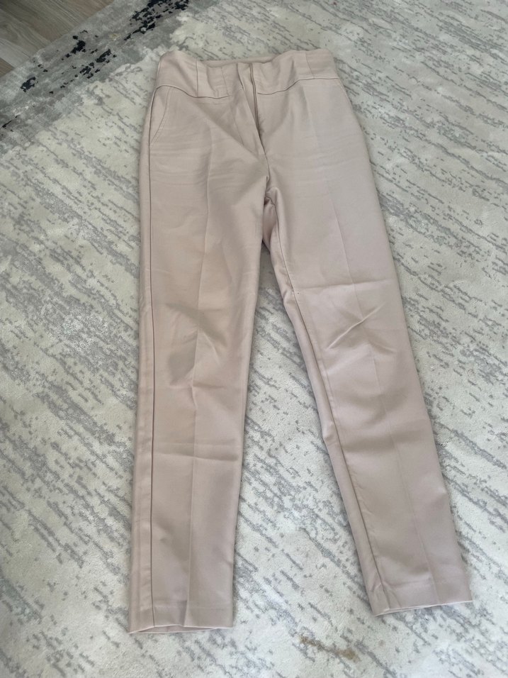 Bej renkte, midi boy, düz kesim kadın kumaş pantolon. Rahat kesimi ve sentetik kumaşıyla ofis için şık ve zahmetsiz bir görünüm sunar.